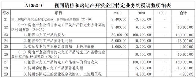 项目于2020年12月竣备并交房,当年会计结转售房收入150,000万元,结转税金附加4900万元;2021年度结转售房收入20000万元,结转税金附加700万元。当地预计毛利率为10%,假设项目实际毛利率为18%(成本均有合规票据),则2019、2020、2021年度利润表及A105010表预计毛利额可分别填写如下: