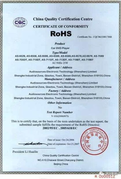 RoHS是《电气、电子设备中限制使用某些有害物质指令》(the Restriction of the use of certain hazardous substances inelectrical and electronic equipment)的英文缩写。RoHS一共列出六种有害物质,包括:铅Pb,镉Cd,汞Hg,六价铬Cr6+,多溴二苯醚PBDE,多溴联苯PBB。欧盟在2006年7月1日开始实施RoHS,使用或含有重金属以及多溴二苯醚PBDE,多溴联苯PBB等阻燃剂的电气电子产品都不允许进入欧盟市场。RoHS针对所有生产过程中以及原材料中可能含有上述六种有害物质的电气电子产品,主要包括:白家电,如电冰箱,洗衣机,微波炉,空调,吸尘器,热水器等,黑家电,如音频、视频产品,DVD,CD,电视接收机,IT产品,数码产品,通信产品等;电动工具,电动电子玩具,医疗电气设备.