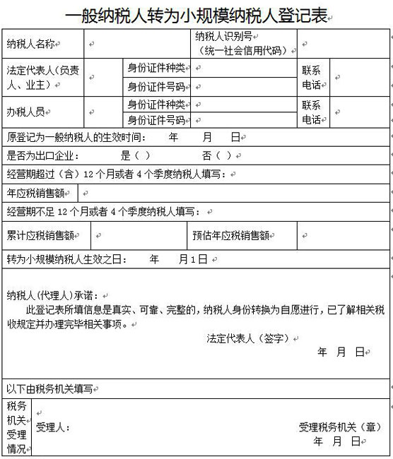 1、正确、完整填写《一般纳税人转为小规模纳税人登记表》。