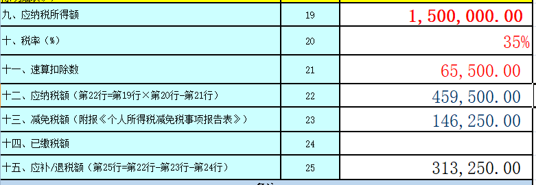 那么全年应纳税额=150*35%-6.55-0.6=45.35